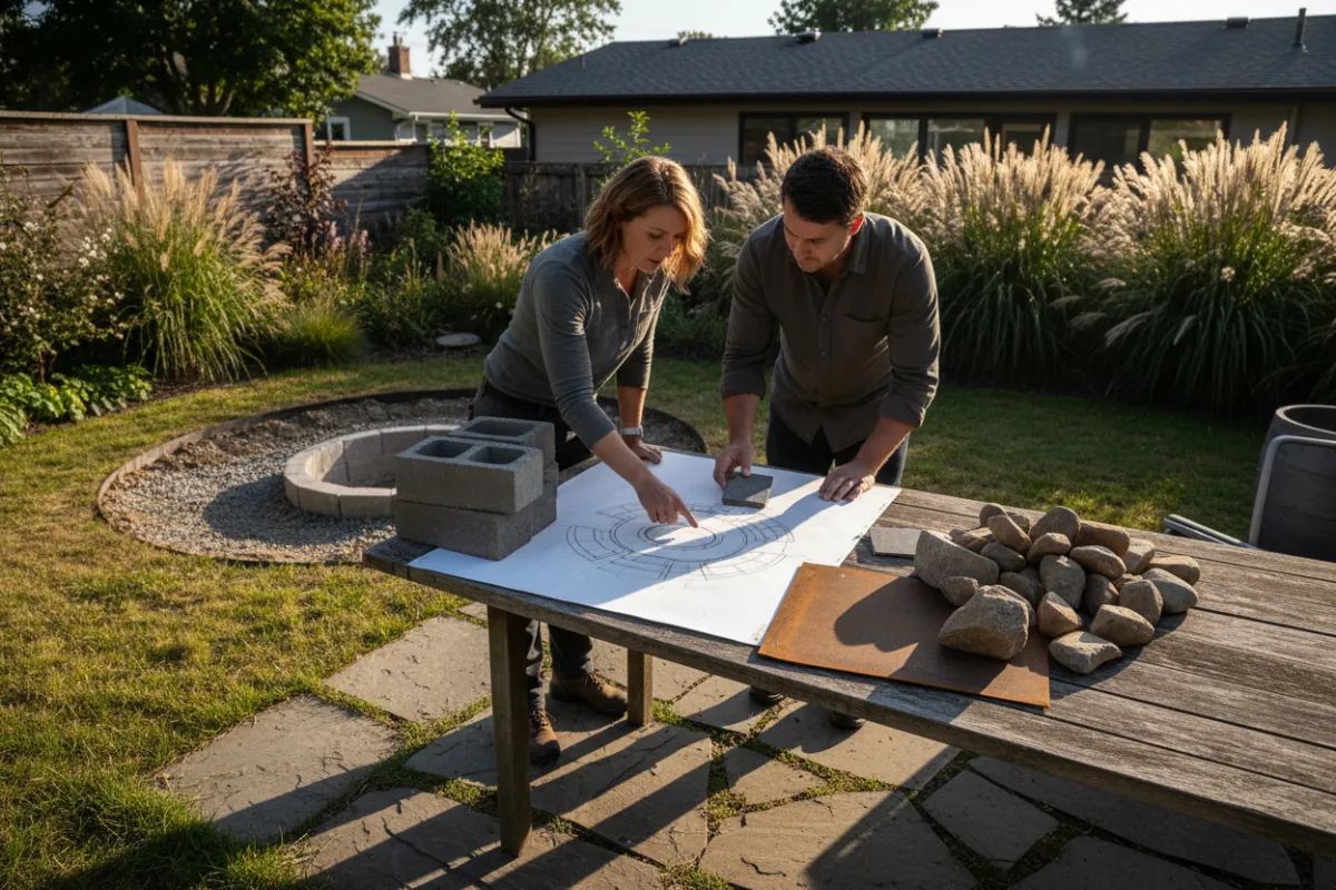 We take measurements, review design choices (stone styles, gas inserts, and seating), and confirm any necessary permits to finalize your plan.